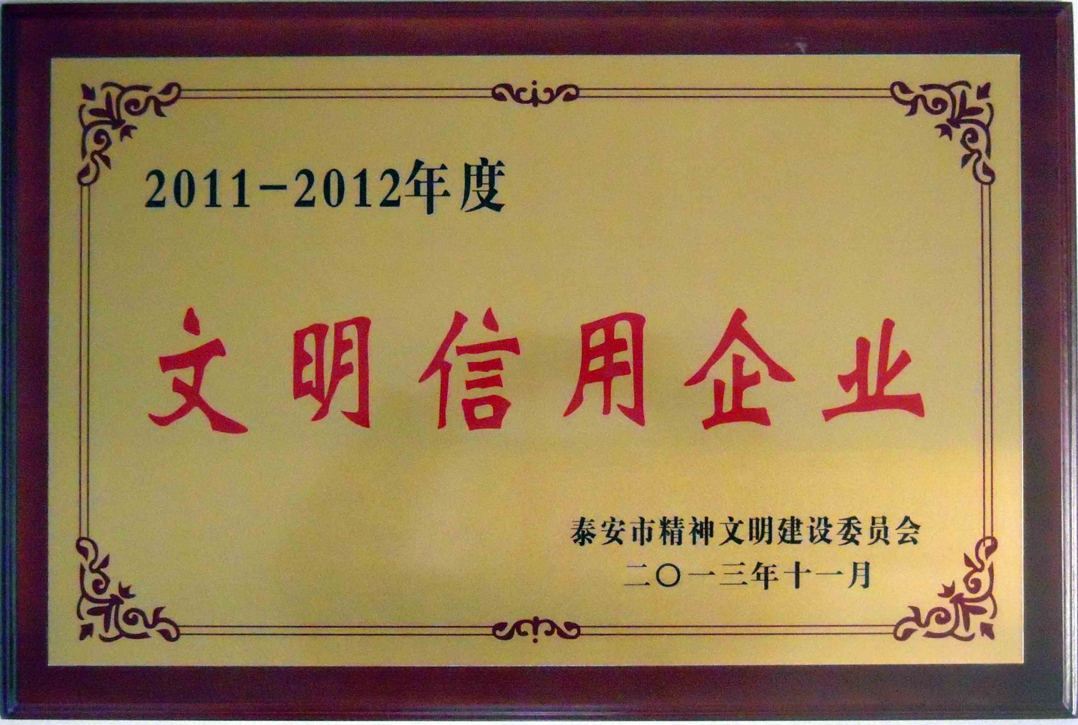 根据泰安市精神文明委员会下发《关于命名2011-2012年度泰安市文明诚信金融单位、文明信用乡镇、文明信用企业的决定》(泰文明委【2013】10号),集团公司被授予“泰安市文明信用企业”称号。